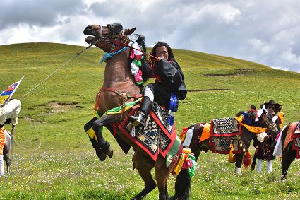 花海上、馬匹間,康巴漢子摩拳擦掌;藍(lán)天下、溪流旁,盛裝觀眾搖旗吶喊。19日,作為運動會的分項活動之一,德差鄉(xiāng)羊格貢草原上演了一場500匹駿馬在康巴漢子駕馭下同場飛奔的馬術(shù)表演視覺盛宴。伴隨著鏗鏘有力的馬蹄聲、駿馬的嘶鳴聲和觀眾的歡呼聲,一幅集奔騰之美、力量之美、風(fēng)光之美于一體的壯美畫卷快速閃過觀眾眼簾。