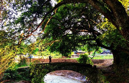 水口小橋流水,古樹蓊郁。村子打開山門,山風(fēng)整裝待發(fā),夏天不遠(yuǎn)了。茂盛的地脈樹下,都能看到傘的影子。