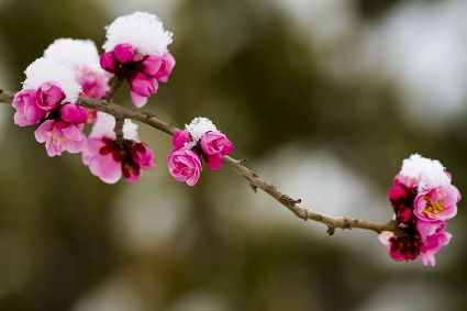 季春初始,濃霧夾帶著高原的寒風(fēng),彌漫在這片純凈素簡(jiǎn)的大地上。朦朧中,紛紛揚(yáng)揚(yáng)的春雪,落在山峰,落在河谷,落在屋檐,落在林間,頃刻間就給萬(wàn)物披上了銀白色的春裝。山麓、河谷、村落被白色潤(rùn)染,像是喚醒一簾純白的甜蜜美夢(mèng);枯樹(shù)、春花、牧草被水汽滋潤(rùn),像是撫慰一冬的孤獨(dú)清寂。