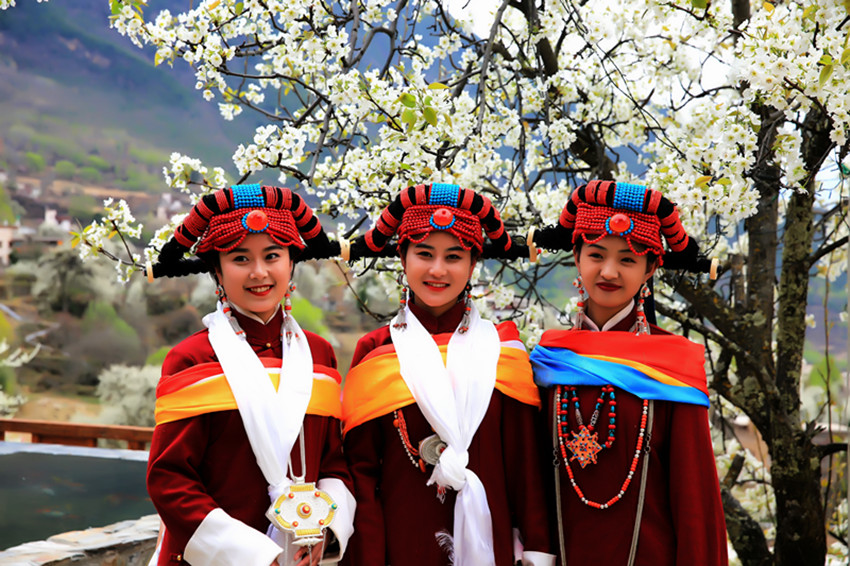 雪山、碉樓、藏寨、美人共同勾勒出一幅精美絕倫的春日藏寨梨花圖。春日里的梨花造就了丹巴的“三絕”?!耙唤^”即梨花配藏寨;“二絕”即梨花配碉樓;“三絕”即梨花配美人。