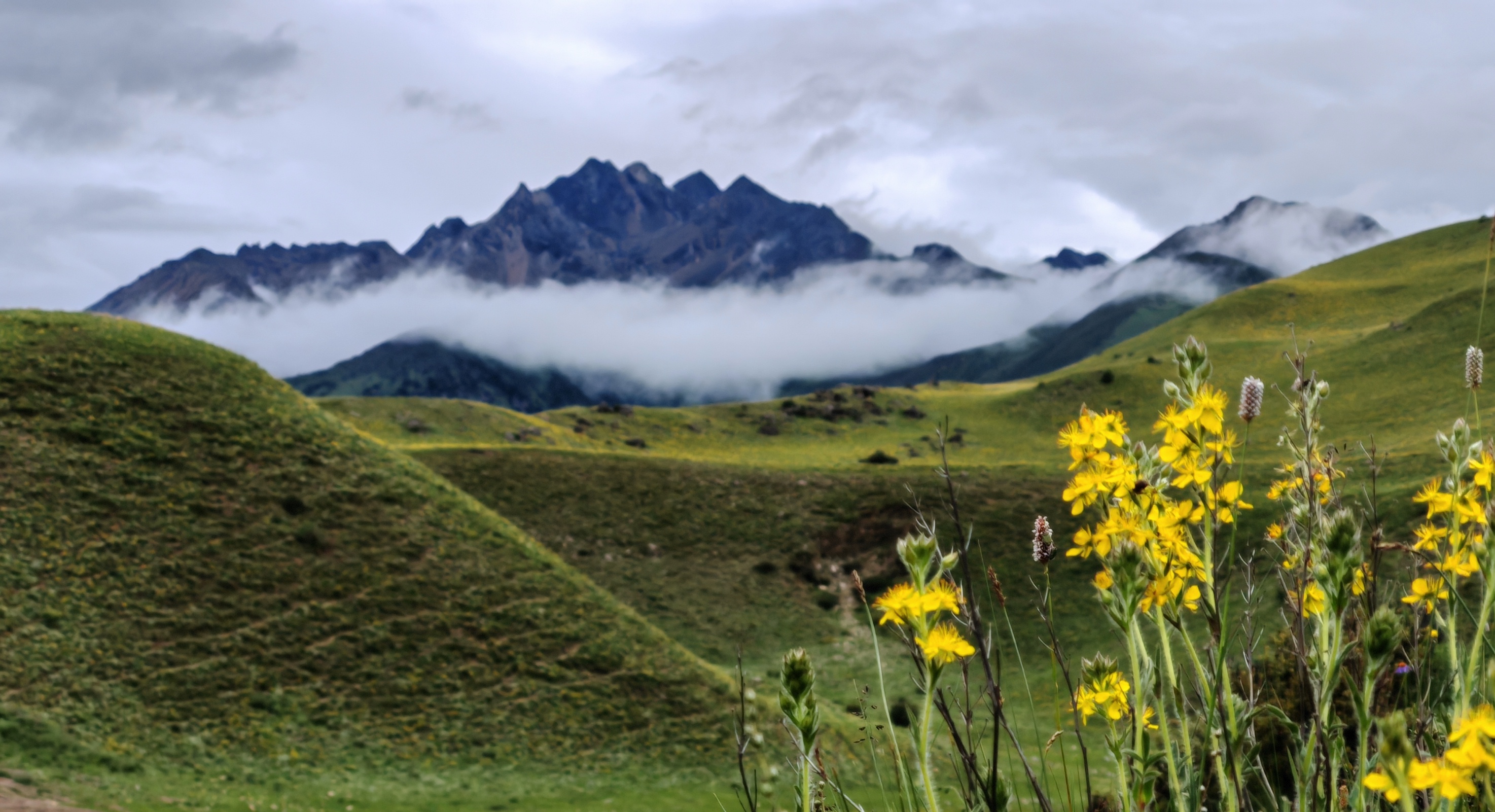 七月,理塘的天氣多變,上一秒藍(lán)天白云,下一秒冷雨紛飛。雨水剛停,夕陽直落格聶山峰,云霧宛若與熾熱鋼花碰撞,瞬間變幻出千奇百彩。云霧先是在山凹間奔突,卻又被陽光的魔力死死拽住,最后云霧與光線交織,烘托出格聶神山夢幻般的真容。飄忽的云霧讓山勢變得更加神秘莫測,夕陽的金暉讓神山變得越發(fā)莊嚴(yán)神圣。此時時刻,一個人與一座山,是千億年的一個交匯,一個人與一座山,也是此刻最好的和諧。