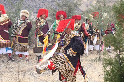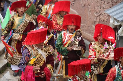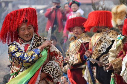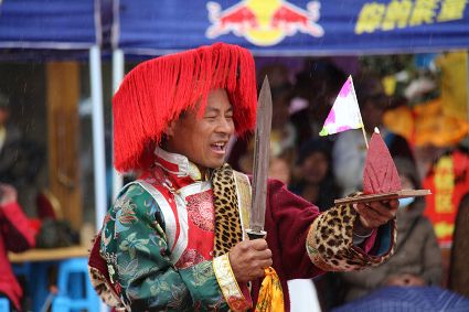除了歌舞文化,德欽還是民俗文化最大的平臺,神山祭祀是村村寨寨必不可少的活動,在德欽,藏民對山水自然賦予了靈性,認為自然也是和人一樣有著生命和靈性,尊重自然演繹出神山祭祀活動豐富多彩。“刀贊” 藏語稱“百諧”。在德欽農(nóng)村,刀贊是祭祀活動的重頭戲,這一天,不亞于一個盛大的服飾表演。相傳“百諧”是古時村民為消除戰(zhàn)亂,祈福平安的一項傳統(tǒng)祭祀活動,延續(xù)至今已經(jīng)成為一項傳統(tǒng)的民俗活動?!鞍僦C”既是祭祀活動的一個儀式,也是一個獨立的傳統(tǒng)民俗活動,村里每戶一男丁在這一天必須參加“百諧”?!疤K夏”是村里男人戴的最為隆重的帽子,他不同于金邊帽和狐皮帽。長刀是“刀贊”的道具, “吉祥的日子里,我們一敬天地,賜給我們帶來幸福的生活;再敬尊敬的共產(chǎn)黨,為我們帶來平安吉祥;三敬慈祥的雙親,教會我們?nèi)绾巫鲆粋€好人……”朗朗上口的說詞伴著閃閃的刀光起舞,頗具康巴壯士的英武陽剛。