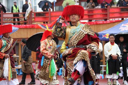 射箭也是德欽以及周邊些村落的重要民俗活動之一,村里的男人們盛裝出場,在射箭場彎弓搭箭,從7、8歲小孩到50多歲的老人都要參加射箭,甭管你射得中靶子與否,笑聲里充滿了和諧和喜慶。德欽縣的江坡村,在每年桃花盛開的季節(jié),都要開展盛大的射箭節(jié),全縣的射箭愛好者都前來一顯身手,康巴漢子們不僅射得一手好箭,還得會拉弦子,悠揚的弦子聲可以給射手們加不少分,活動的初衷就是要求藏族男人必須能文能武。弦子聲聲,唱出了藏家百姓美好的生活,村里的女人戴上了各種金銀首飾,男人們手拉弦子,盡情歡暢的唱著、跳著,村里的老人們是忠實的觀眾,看著大家在舞場里的步子,他們也跟著笑得合不攏嘴,有些年輕人還不時跑出舞場到場邊的老人們面前請教弦子的唱詞,老人們總是不厭其煩的傾囊相授,因為他們曾經(jīng)也是弦子舞場的“明星”。
