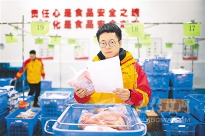 陜西黃馬甲物流配送股份有限公司生鮮中央工廠的工作人員認(rèn)真核對供應(yīng)鏈產(chǎn)品。