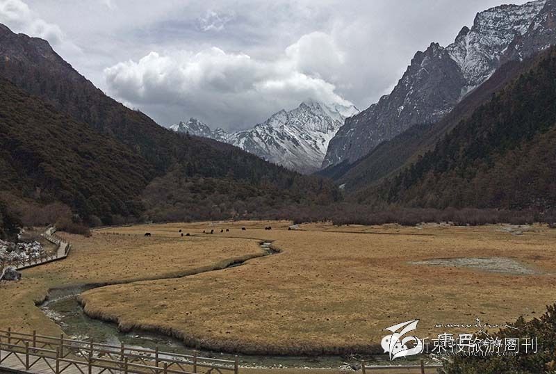 大概20分鐘左右的車程,我們到了洛絨牛場。這是一個被雪山環(huán)繞的草甸,仙乃日、央邁勇和夏郎多吉三座6000米的雪峰呈“品”字形分別位于西北、東南和東面,雪峰之間,形成了一片長寬約5公里的高原寬谷。