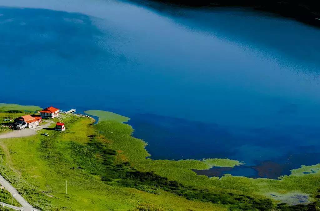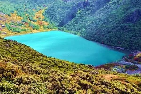 被原始森林和草甸環(huán)抱的五須海,當(dāng)?shù)厝擞鳛椤跋膳釆y的明鏡”,湖水碧綠透亮,將周?chē)纳剿吞炜杖痴赵诤?,幽靜的像一幅畫(huà)。從夏到秋周?chē)倩ㄊ㈤_(kāi),古樹(shù)盤(pán)根錯(cuò)節(jié)、藤枝攀沿纏繞,杜鵑樹(shù)伸向湖面,仿佛進(jìn)入原始古樸的仙境。