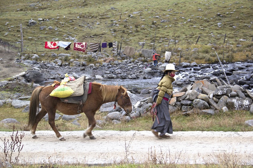 莫斯卡的女人或在寺廟點(diǎn)酥油燈,或帶孩子,或牽馬牧草,或在溪邊淘衣,或出門(mén)打水……她們的勤勞和樸實(shí)滋養(yǎng)著莫斯卡,滋養(yǎng)著莫斯卡的生命。她們用黑、紅、綠那樣跳躍的顏色搭配出獨(dú)具風(fēng)格的服飾,背著你遠(yuǎn)去,又迎著你走來(lái),她們美麗的背影裝扮了寂靜的莫斯卡小巷。