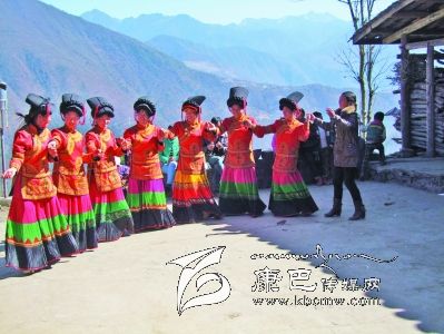 在磨西的青崗坪村,在被冰雪覆蓋的山巒眺望著的村莊,春節(jié)來臨的日子,彝家 兒女打開了彝家的美酒,燦爛的陽光搖曳濃烈的酒香,穿上紅紅的彝家服裝,彝家的女兒手拉手跳起舞。