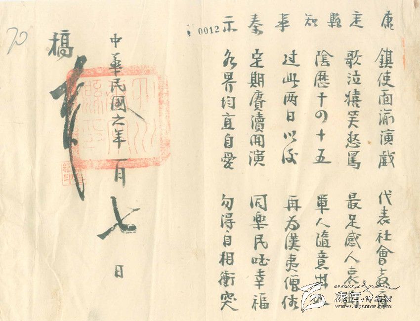 除此之外,康定縣知事又煞費(fèi)苦心地再寫了一篇“順口溜”式的告示,告示上寫道:鎮(zhèn)使面喻演戲,代表社會(huì)教育。歌泣嬉笑怒罵,最足感人衷曲。陰歷十四十五,軍人隨意出入。過(guò)此兩日以后,再為漢藏僧俗。定期庚續(xù)開演,同樂民國(guó)幸福。各界均宜自愛,不得自相沖突。