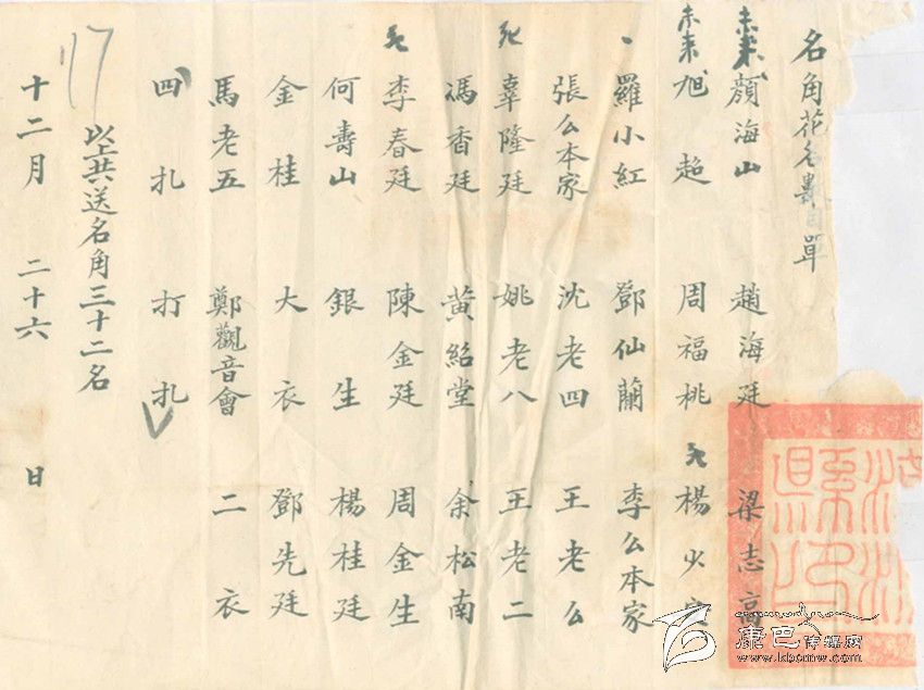 不準(zhǔn)賭博做什么呢?當(dāng)時(shí)的當(dāng)權(quán)者還是費(fèi)了一番心思,他們從外地請(qǐng)來(lái)了一個(gè)川戲班子,為了吸引人們關(guān)注,康定縣政府把戲班的名角以及配角演員名單寫成海報(bào)張貼到街頭,又抄成傳單廣為散發(fā),用現(xiàn)在的話說(shuō)是,做足了戲班出場(chǎng)前的前期宣傳工作。從名單上看,這是一個(gè)不小的戲班子,所謂名角竟有32名之多。想來(lái)對(duì)于沒有多少文化生活的康定民眾,還是有一定的吸引力。