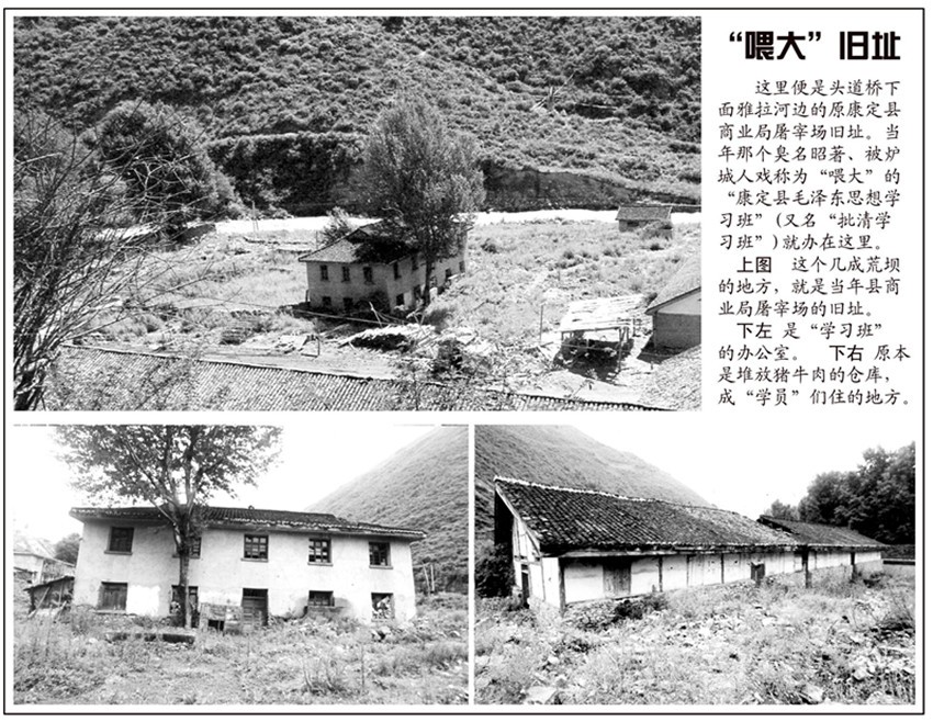 當年康定縣搞“一批雙清”,特地選在雅拉河邊上康定縣商業(yè)局的屠宰場辦了個以“催肥”為目標之一的“學(xué)習(xí)班”,其意就是要在這里將一些“不夠秤”的“5.16”“三老會”對象,“一批二斗”擠“材料”,像屠宰場催肥豬一樣“展”夠秤。所以爐城人將它戲稱為“喂大”。