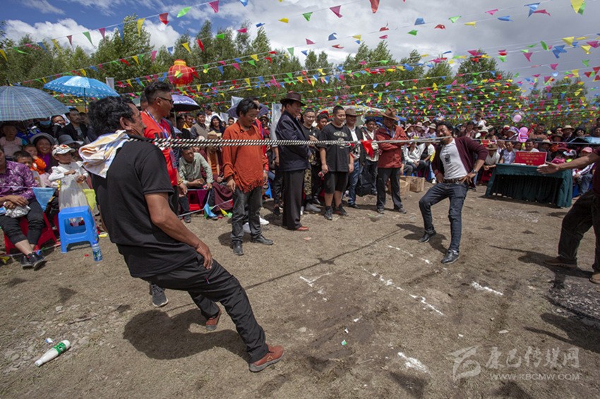 除以上活動(dòng),滾桶接力、俯撐馬鞍吃葡萄、穿藏裝揉糌粑、套牛角等趣味比賽無(wú)不展示民族體育的獨(dú)特風(fēng)格?!斑@種拔河還是第一次見(jiàn),很有意思?!逼渲校案裢獭北荣悾ò褞ё犹自诓弊由习魏樱┥畹糜^眾喜愛(ài)。