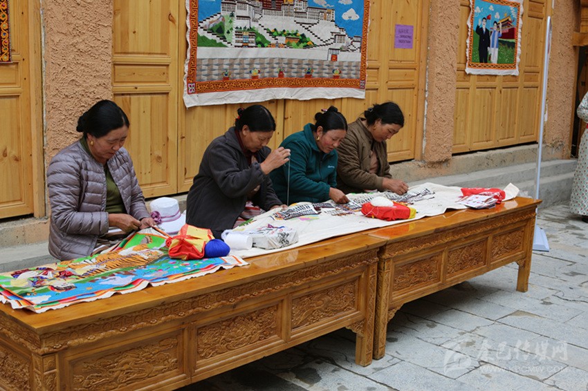 在藏繡展點,5名農(nóng)牧民婦女正在合繡一幅藏族建筑刺繡作品。“我從16歲開始跟著父親學藏繡,傳到我這已經(jīng)是第四代了。除了‘六長壽’、度母像等傳統(tǒng)圖案,今年是新中國成立70周年,我還繡了一幅天安門作品。”47歲的傳承人達打介紹道。