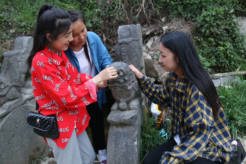游客金玉鑫(藍(lán)色衣服)與同伴在官寨石獅處。