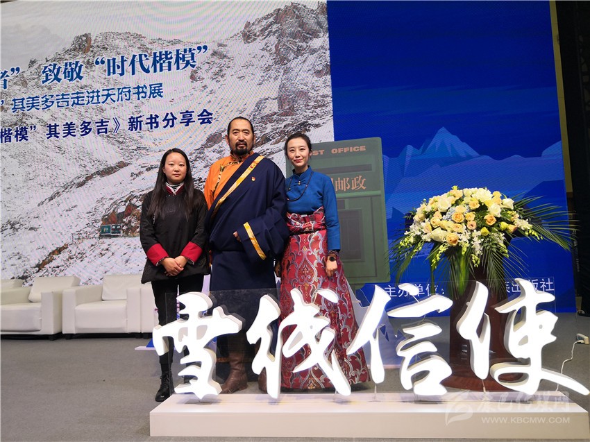 在分享會(huì)舞臺(tái)的一側(cè),靜置著書籍《雪線信使——“時(shí)代楷模”其美多吉》放大后的封面。封面上,其美多吉、藍(lán)天與雪山相得益彰,構(gòu)成了一幅獨(dú)具特色的畫面。