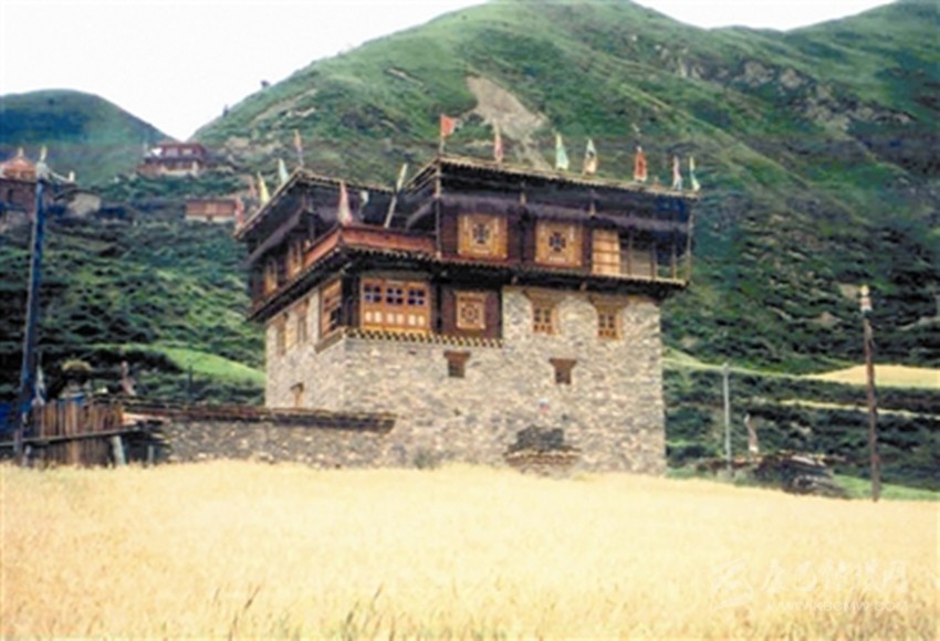 色爾壩藏寨以石頭、泥土、木頭為主要建筑原材料,絕不用水泥、鋼材等現(xiàn)代建材,甚至屋頂也不用瓦片,全部采用泥土,取材十分簡(jiǎn)單、方便,然而因?yàn)樾藿ㄈ咳斯?,工期較長(zhǎng),需要2-4個(gè)月或更長(zhǎng)時(shí)間。當(dāng)?shù)赝诵莞刹控晠s秋告訴筆者,藏寨房屋層數(shù)有較嚴(yán)格的規(guī)定,普遍為3—4層,不少于3層,也不會(huì)高于4層,分別象征一個(gè)人的頭部、胸部、腹部和腿;底層一般用來(lái)關(guān)牲畜或堆放雜物,第二層存貯糧食,第三層居住,第四層設(shè)置佛堂,這種建筑風(fēng)格不同于周邊爐霍、道孚、丹巴民居,自成一體。藏寨造型完全擬人化,外形奇特,上大下小呈倒立的品字形,猶如一個(gè)頭戴盔甲、身披戰(zhàn)袍的將軍;房屋上層樓廊外部均以高山柳條垂掛環(huán)繞,以象征大將色爾哇·尼崩達(dá)雅的披肩長(zhǎng)發(fā);房頂正中的小旗幟就象將士頭盔上的帽纓;房屋右側(cè)隨風(fēng)飄拂的經(jīng)幡,恰似將軍手握長(zhǎng)矛在沖鋒陷陣。房屋依山而建,傍山而立,外形高大雄偉。深厚的格薩爾文化為藏寨蒙上了一層神秘的面紗。