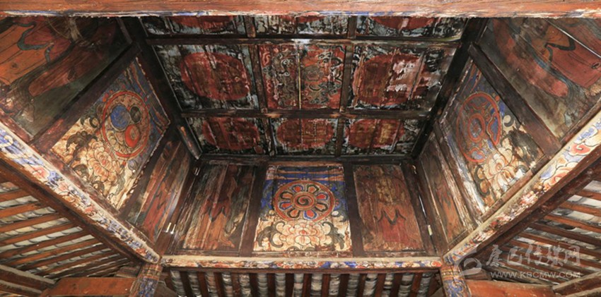 在介紹的過程中,我發(fā)現(xiàn)這座小寺不簡單,很想到正殿看看。到了殿里,我發(fā)現(xiàn)殿內佛像具備,壁畫、板畫以及唐卡數(shù)量眾多,皆是工藝精湛。廟宇四檐有青銅制風鈴4個,但是一樓的壁畫看著像是維修過。