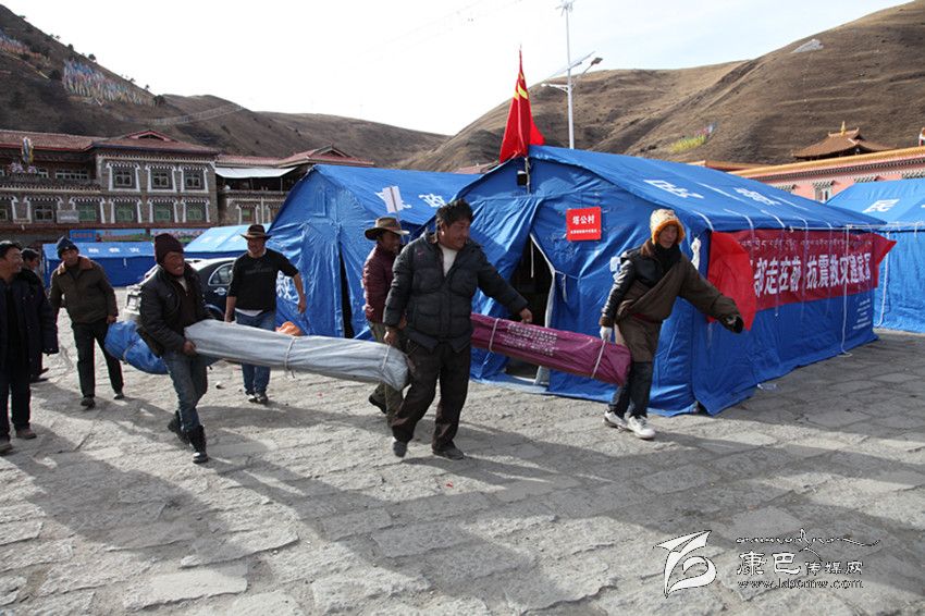 塔公鄉(xiāng)塔公村黨員服務(wù)隊在支書張東升的帶領(lǐng)下為災(zāi)民搭建帳篷。