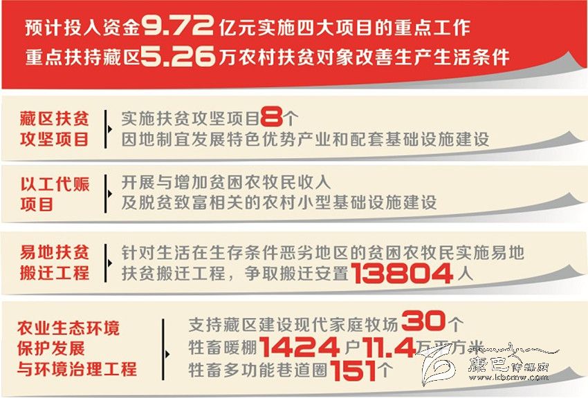 答:比如藏區(qū)扶貧攻堅(jiān)項(xiàng)目,從實(shí)施內(nèi)容來看,今年在阿壩州、甘孜州、涼山州木里縣實(shí)施扶貧攻堅(jiān)項(xiàng)目8個(gè),其中阿壩州3個(gè)、甘孜州4個(gè)、涼山州木里縣1個(gè),預(yù)計(jì)投入中央財(cái)政專項(xiàng)扶貧資金4000萬元,表面上延續(xù)了去年的工作,但今年實(shí)施項(xiàng)目將突出兩大要求,一是項(xiàng)目要瞄準(zhǔn)今年有計(jì)劃摘帽的貧困村、計(jì)劃脫貧的貧困戶,集中力量解決突出問題。二是項(xiàng)目資金要到村入戶,因地制宜發(fā)展特色優(yōu)勢(shì)產(chǎn)業(yè)和配套基礎(chǔ)設(shè)施建設(shè),確保精準(zhǔn)扶貧。