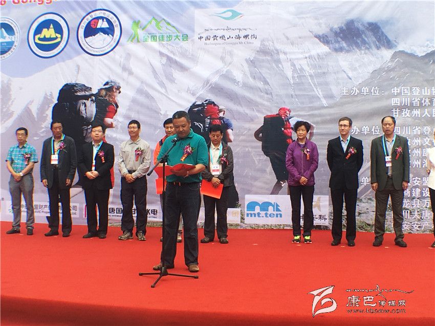 開幕式上,四川省體育局副局長蔣顯倫為2016中國•甘孜環(huán)貢嘎山百公里國際山地戶外運動挑戰(zhàn)賽暨徒步大會作致辭。