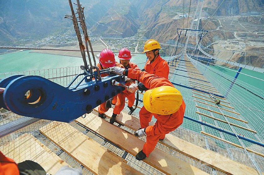 經(jīng)過2小時(shí)的牽引施工,4月5日,雅康高速公路重點(diǎn)控制性工程、被稱為“川藏第一橋”的瀘定大渡河興康特大橋首根主纜索股成功架設(shè),跨越大渡河“鎖定”在康定、雅安境內(nèi)的錨碇上。特大橋上部構(gòu)架主體工程施工由此正式啟動(dòng),甘孜藏區(qū)迎來首條高速大通道指日可待。