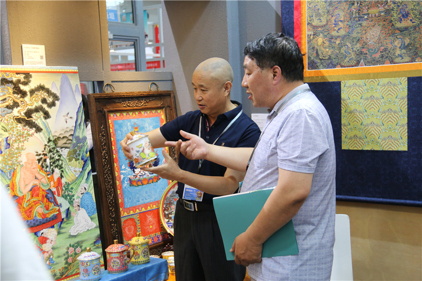 本網(wǎng)訊(記者 宋志勇 文/圖)“我是一次摔壞陶瓷,成就了我和馮建華藝術(shù)合作?!边@是參加第十四屆中國(深圳)國際文化產(chǎn)業(yè)博覽交易會上,來自爐霍縣華彩文化傳播有限公司參展商付國華這樣說,而在馮建華心里,雖然這是他的鎮(zhèn)館之寶,但他對付國華這位千里迢迢從甘孜藏區(qū)來到景德鎮(zhèn),感到自豪和高興,于是結(jié)下了深厚的感情,因此完成了唐卡與陶瓷藝術(shù)的完美結(jié)合——高溫粉彩瓷板。