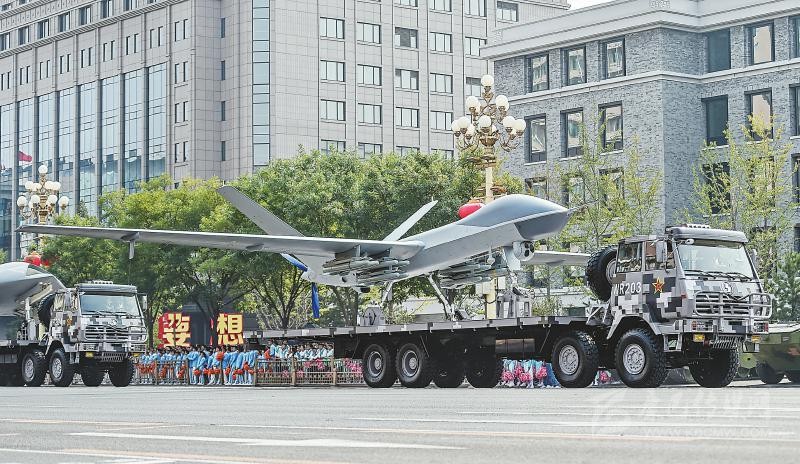 在兩輛指揮引導車帶領下,由攻擊-2無人機、攻擊-11無人機和反輻射無人機組成的無人作戰(zhàn)第2方隊通過天安門,向世界展示了中國無人作戰(zhàn)平臺的又一嶄新成就。