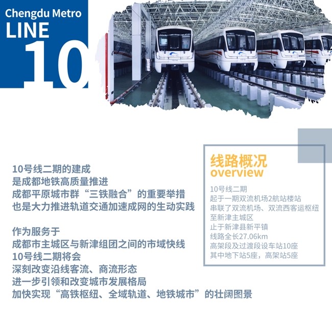 10號線二期起于一期雙流機場2航站樓站,串聯(lián)了雙流機場、雙流西客運樞紐至新津主城區(qū),止于新津縣新平鎮(zhèn),線路全長27.06km,高架段及過渡段設(shè)車站10座,其中地下站5座,高架站5座。