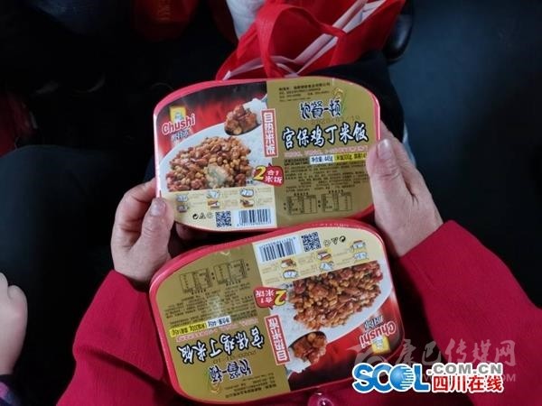 18日中午12時, 列車出發(fā)2小時后,巴中恩陽人鄔兵領(lǐng)到了來自家鄉(xiāng)的午餐——一盒自熱米飯,配菜是宮保雞丁?!安诲e不錯,今年不用吃方便面了?!倍松厦罪埖泥w兵笑了笑。