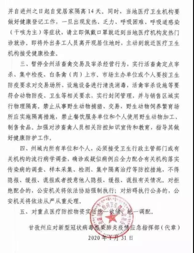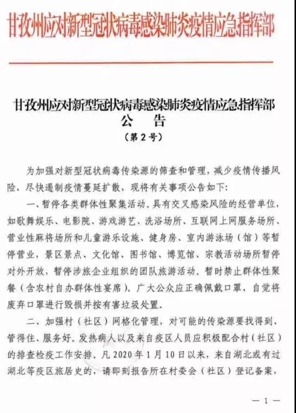 重磅!甘孜州應(yīng)對新型冠狀病毒感染肺炎疫情應(yīng)急指揮部連發(fā)第1、2、3號公告,做出這些要求