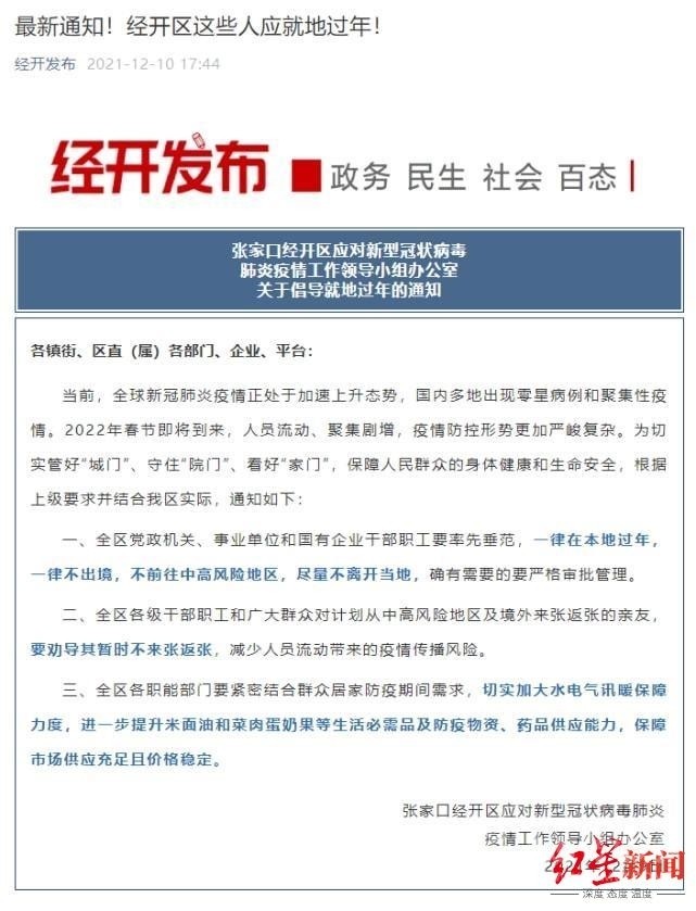 12月9日,河北張家口經(jīng)開(kāi)區(qū)也發(fā)出通知:全區(qū)黨政機(jī)關(guān)職工等就地過(guò)年。通知中倡導(dǎo):全區(qū)黨政機(jī)關(guān)、事業(yè)單位和國(guó)有企業(yè)干部職工要率先垂范,一律在本地過(guò)年,一律不出境,不前往中高風(fēng)險(xiǎn)地區(qū),盡量不離開(kāi)當(dāng)?shù)?,確有需要的要嚴(yán)格審批管理。