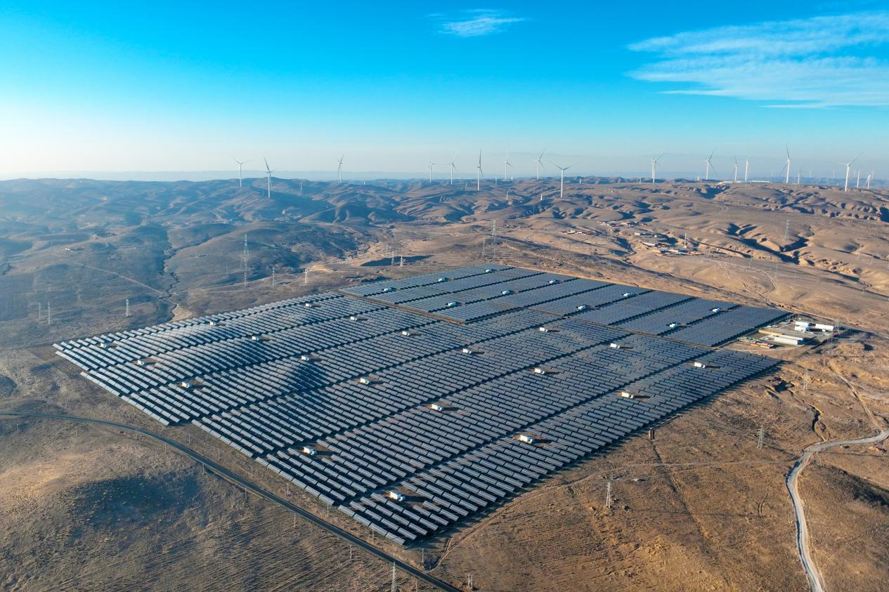 △ 2024年1月3日,寧夏銀川,俯瞰靈武市境內(nèi)的“沙戈荒”光伏基地,一塊塊藍(lán)色光伏板源源不斷地輸送著綠色電能。
