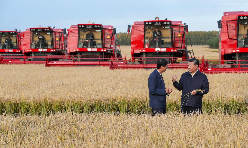 2018年9月25日,金秋時(shí)節(jié),稻浪滾滾,黑龍江農(nóng)墾建三江管理局七星農(nóng)場(chǎng)萬畝大地號(hào)豐收在望。習(xí)近平總書記走進(jìn)正在收割的地塊,拿著稻穗,同工作人員交談,詳細(xì)了解糧食生產(chǎn)和收獲情況。
