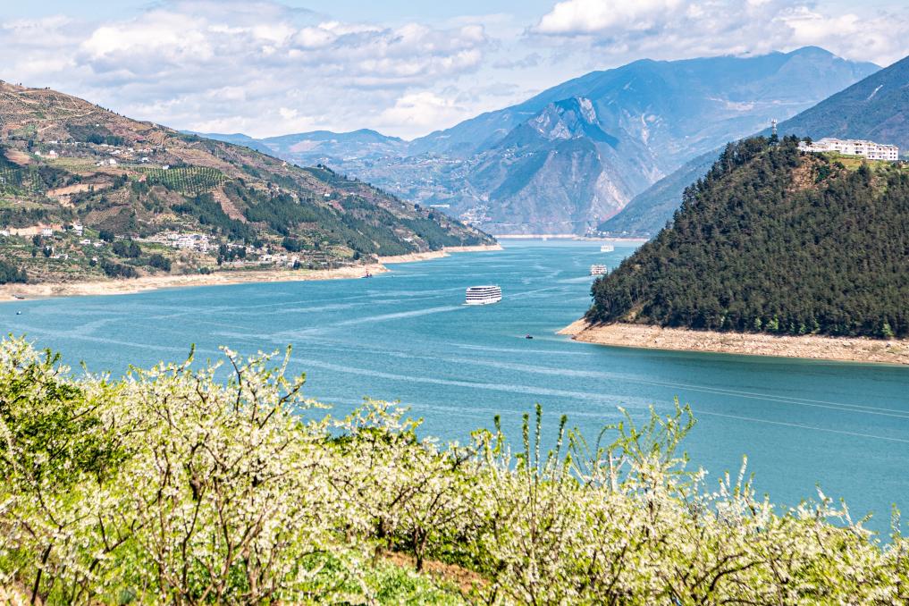 ??3月25日拍攝的重慶市巫山縣曲尺鄉(xiāng)長(zhǎng)江兩岸的萬(wàn)畝李花。新華社記者 唐奕 攝