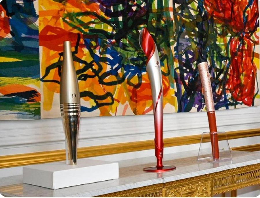 ??在法國愛麗舍宮一層肖像廳,三支奧運火炬并排而立,格外引人注目。這是中法兩國元首夫婦互贈禮品之一。
