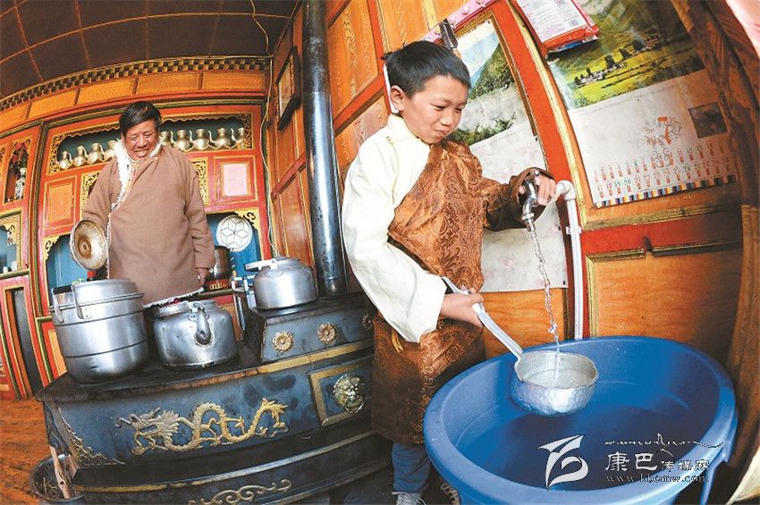 被稱為世界高城的理塘縣,“吃水難”過去一直是當(dāng)?shù)厝罕娚铍y題。2012年實(shí)施對(duì)口援建以來,樂山市和理塘縣把此項(xiàng)工作列為 “一號(hào)民生工程”來抓。2013年,樂山市和理塘縣在位于海拔5000米的理塘縣奔戈鄉(xiāng)境內(nèi)的索絨山上開建奪曲河水庫,2014年7月奪曲河水庫全部竣工,2015年10月,理塘縣首批2200戶自來水實(shí)現(xiàn)入戶,到今年底縣城中心城區(qū)將全部實(shí)現(xiàn)自來水入戶供水。圖為扎吉和家人正歡喜地接水準(zhǔn)備做飯。