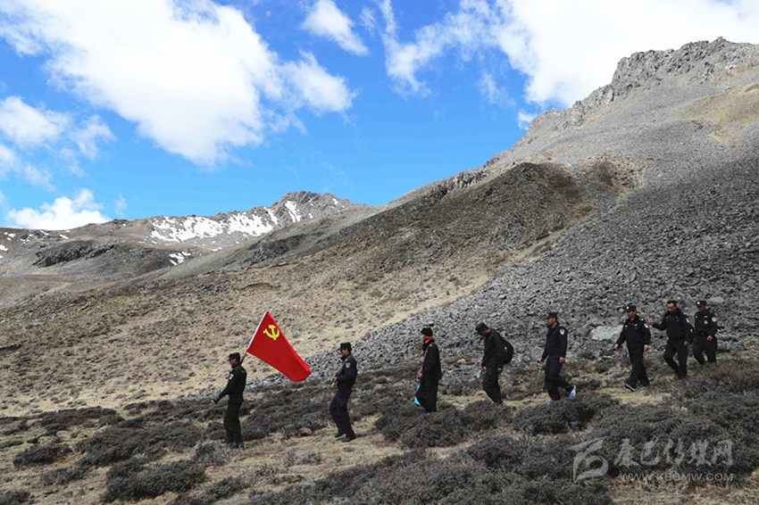 為確保蟲草采挖期間的社會治安穩(wěn)定,縣公安局抽調(diào)精干力量,前往哈幾山、莫庫溝等多個蟲草采挖點開展巡山維穩(wěn)。這次和我們一起開展常規(guī)巡邏的共有8名公安干警。降初是本地人,1.78米的個子,一路上,他高舉黨旗、步履矯健、勇往直前,成為我們大家的“領(lǐng)路人”,大家經(jīng)常和他開玩笑說:“跟著黨(旗)走永遠不迷路”。