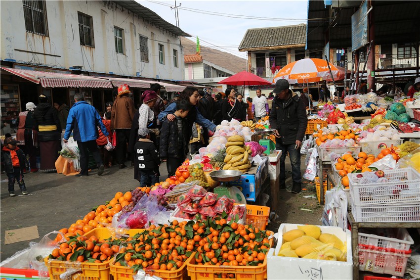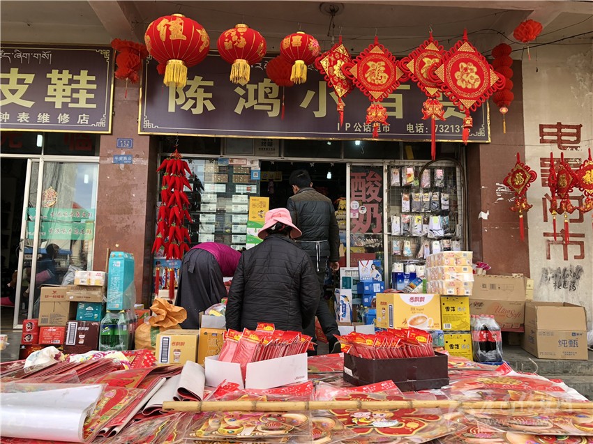 新都鎮(zhèn)格色村的丹真大哥和老伴兒其吉牽著8歲的孫子正在干果店里挑選各類干果,身后的背簍里水果、蔬菜、酥油、牛肉等農(nóng)畜產(chǎn)品以及中國(guó)結(jié)、年畫、對(duì)聯(lián)、掛圖等吉祥的節(jié)日物品應(yīng)有盡有。