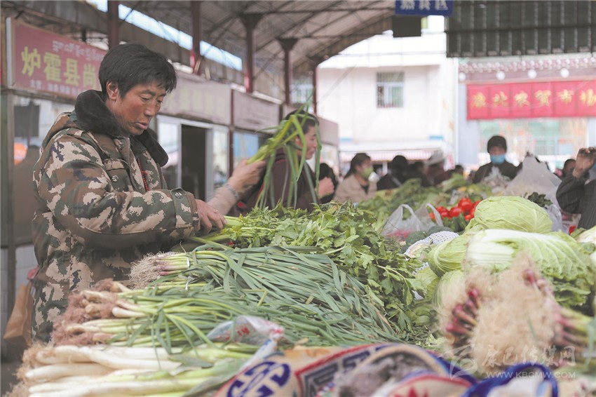 農(nóng)貿(mào)市場(chǎng)貨源充足,市民正在采購(gòu)蔬菜。