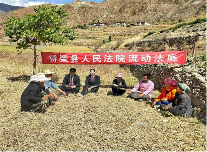 在曲雅貢鄉(xiāng)二號(hào)壩村進(jìn)行法律宣講時(shí),村民澤某請(qǐng)求法院判決其和丈夫扎某離婚,“流動(dòng)法庭”法官立即在田間地頭組織調(diào)解。調(diào)解過(guò)程中當(dāng)事人情緒抵觸、相互埋怨,尤其涉及到財(cái)產(chǎn)分割和子女撫養(yǎng)等問題時(shí)情緒波動(dòng)大,場(chǎng)面一度僵持。法官憑借豐富的調(diào)解經(jīng)驗(yàn),先從講解相關(guān)法律規(guī)定入手,告知當(dāng)事人享有的權(quán)利義務(wù),而后對(duì)離婚財(cái)產(chǎn)分割、子女撫養(yǎng)問題從情理法多角度層層剖析,促使雙方達(dá)成和解協(xié)議,有效化解了矛盾。“流動(dòng)法庭”以宣促調(diào)、以案說(shuō)法,達(dá)到了審理一案、教育一片、穩(wěn)定一方的效果。