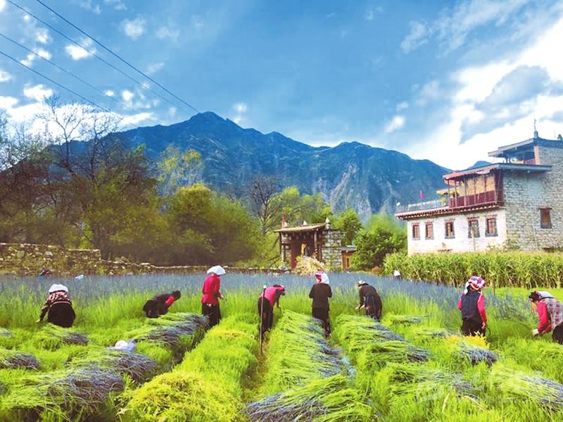 丹巴縣中路鄉(xiāng)呷仁依村村民在收割薰衣草。 文健康 攝