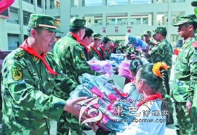 儀式上,8722部隊向?qū)W校贈送了價值萬余元的學(xué)習(xí)用品,拿著裝有鉛筆、水彩筆等各種文具的“愛心書包”,孩子們興奮不已。12歲的藏族女生登真啟珍告訴筆者:“今年的‘六一’兒童節(jié),武警部隊的叔叔們專門來看望我們,還送來了禮物,我感到特別開心。”儀式上,少先隊員們給參加慰問的部隊領(lǐng)導(dǎo)戴上鮮艷的紅領(lǐng)巾,孩子們還表演了精心排練的節(jié)目。一張張燦爛的笑臉,一陣陣蕩漾心扉的歌聲,傳遞著駐訓(xùn)武警部隊與當(dāng)?shù)厝罕姖鉂獾聂~水深情。