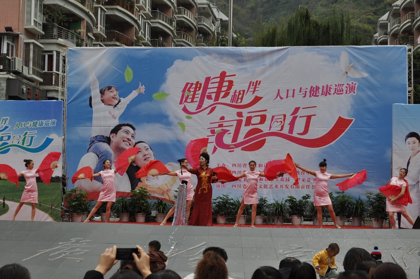 舞臺上“健康相伴•幸福同行”大型演出背景格外醒目,由省虹宇藝術團自編自演的舞蹈《歌舞青春》、金錢板《怪哪個》、小品《你生不生》、四川清音《分級診療就是好》、雜技《烏依人》、戲曲《天府奇葩》等節(jié)目陸續(xù)登場。演員們通過戲曲、歌曲等形式,向廣大觀眾傳播衛(wèi)生計生新政策,臺下各縣屬醫(yī)療衛(wèi)生計生機構醫(yī)務人員免費開展義診活動,為廣大群眾查血壓、詢問病史、咨詢等忙個不停,群眾與演員互動場面感人。演出活動取得良好的教育效果,得到廣大群眾的熱烈歡迎。