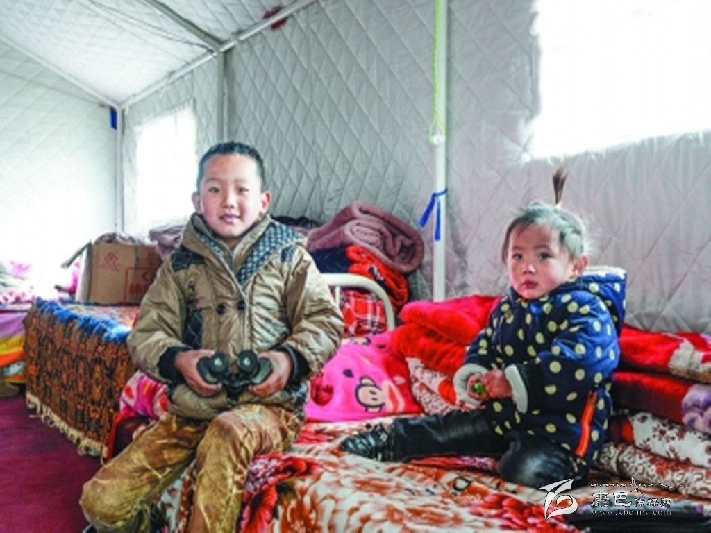震后的第一個新年,記者在塔公鄉(xiāng)江巴村看到,一頂頂藍色的棉帳篷有序搭建在村民自家院落里。隆冬時節(jié),寒風凜冽,走進村民措科家的帳篷,一股熱浪卻撲面而來。小鋼爐上燒著熱水,帳篷里堆放著政府發(fā)放的幾床厚棉被,地上鋪著一層白色的防潮塑料薄膜,措科和三個孩子正圍著爐子烤火。