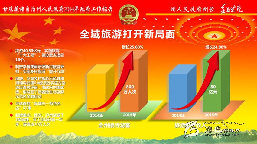 全域旅游打開新局面。投資40.83億元,實(shí)施旅游“十大工程”,建設(shè)重點(diǎn)項(xiàng)目16個(gè)。制定幸福美麗示范新村旅游導(dǎo)則,實(shí)施鄉(xiāng)村旅游“提升行動(dòng)”;稻城、鄉(xiāng)城鄉(xiāng)村旅游示范縣和海螺溝創(chuàng)建5A級(jí)景區(qū)實(shí)施方案通過省級(jí)評(píng)審,海螺溝創(chuàng)國家級(jí)、稻城亞丁創(chuàng)省級(jí)生態(tài)旅游示范區(qū)全面啟動(dòng);評(píng)選首批“最康巴——特色名店”57家。新增重慶、西安、瀘州至亞丁3條航線,亞丁機(jī)場(chǎng)開航一年來,游客達(dá)18萬人次。全州接待游客800萬人次,實(shí)現(xiàn)旅游綜合收入80億元,分別增長25.6%和24.9%。全域旅游更加深入人心,旅游業(yè)正成為我州經(jīng)濟(jì)發(fā)展的“助推器”、群眾增收的“搖錢樹”。