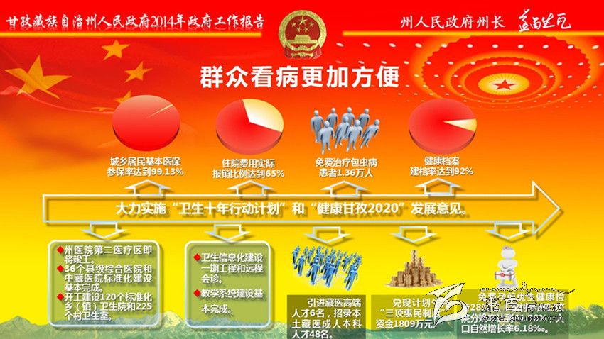 加大民生投入,全年民生支出139億元。全州城鎮(zhèn)新增就業(yè)7400人,城鄉(xiāng)低保實(shí)現(xiàn)應(yīng)保盡保;在全省民族地區(qū)率先實(shí)施醫(yī)療保險(xiǎn)制度城鄉(xiāng)統(tǒng)籌,異地就醫(yī)即時(shí)結(jié)算全面啟動(dòng);在全省率先出臺(tái)大病醫(yī)療保險(xiǎn)規(guī)定。教育事業(yè)加快發(fā)展。新建35所鄉(xiāng)中心幼兒園、22所片區(qū)寄宿制學(xué)校,州高級(jí)中學(xué)開工建設(shè)。全面落實(shí)教育助學(xué)惠民政策,兌現(xiàn)各類補(bǔ)助金4.58億元。城鄉(xiāng)居民基本醫(yī)保參保率達(dá)到99.13%,健康檔案建檔率達(dá)到92%;開工建設(shè)120個(gè)標(biāo)準(zhǔn)化鄉(xiāng)(鎮(zhèn))衛(wèi)生院和225個(gè)村衛(wèi)生室;衛(wèi)生信息化建設(shè)一期工程和遠(yuǎn)程會(huì)診、教學(xué)系統(tǒng)建設(shè)基本完成;兌現(xiàn)計(jì)劃生育“三項(xiàng)惠民制度”資金1809萬元。群眾文化生活日益豐富。建成縣“兩館”12個(gè);開工建設(shè)州民族體育館、州農(nóng)牧民演藝培訓(xùn)中心和14個(gè)縣級(jí)全民健身中心,建成農(nóng)民體育健身工程739個(gè);開展 “送文化下鄉(xiāng)”近千場(chǎng);康巴文化研究院“四大工程”全面啟動(dòng)。深入實(shí)施“百千萬康巴英才工程”,人才科技工作扎實(shí)有效。扶貧移民工作成效明顯。完成1360個(gè)貧困村、19.91萬扶貧對(duì)象立卡建檔工作;實(shí)施整村推進(jìn)63個(gè)、連片開發(fā)項(xiàng)目4個(gè)、彝家新寨(村)17個(gè)、索改橋23座,易地扶貧搬遷9850人,2.65萬群眾生產(chǎn)生活條件得到改善。