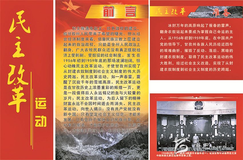《甘孜州檔案館愛(ài)國(guó)主義教育基地》的整個(gè)展覽分為四大板塊。第一部分命名為“自治政權(quán)的建立”,向參觀者介紹了甘孜藏族自治州誕生的歷史過(guò)程;第二部分是“民主改革運(yùn)動(dòng)”,把人們帶回了那段不能忘記的烽火歲月;第三部分是“社會(huì)主義建設(shè)”,深情地回顧了在建設(shè)社會(huì)主義事業(yè)中我州所取得的不平凡的成就;第四部分是“改革開(kāi)放”,讓人們重溫了在改革開(kāi)放的大潮中所經(jīng)歷的那些充滿(mǎn)激情的經(jīng)歷。