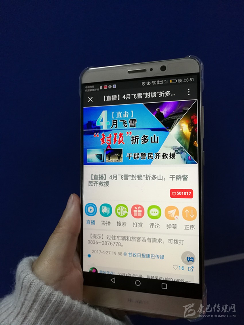 一路上,記者通過甘孜日報微信平臺,將救援情況和群眾的實況,第一時間進行了直播。隨著一條條現(xiàn)場圖片、文字和視頻的及時發(fā)布,人們第一時間得知了折多山受困車輛和群眾得到救助的實際情況,人們紛紛在直播平臺留言,為交通、路政和當?shù)攸h委、政府的救援行動點贊。在對折多山強降雪和受堵現(xiàn)場進行直播報道的同時,甘孜日報社還利用直播平臺,回顧了折多山道路交通難的歷史,并再次發(fā)布雅康高速修建、折多山隧道立項等重大交通建設(shè)工程的進展情況,又對此次折多山風雪阻斷道路交通,導致車輛和人群滯留的特殊原因進行了報道和澄清,并報道了風雪中仍有不少徒步游客繼續(xù)甘孜之旅的情況,第一時間讓更多的人了解到,飛雪并未對道路造成致命影響,甘孜州的道路交通狀況和應(yīng)急處置能力已經(jīng)得到了極大的提升,完全有能力保障人們出行以及生命、財產(chǎn)安全。