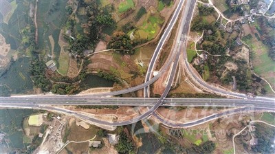 上午11時(shí)許,當(dāng)記者驅(qū)車到達(dá)對巖樞紐互通立交,用無人機(jī)從空中俯拍,這個(gè)縱橫交錯(cuò)、恢弘磅礴的交通樞紐,宛如盤旋在云端的銀龍,又似在大地上延伸的血脈,其造型、規(guī)模、結(jié)構(gòu)都令人嘆為觀止。