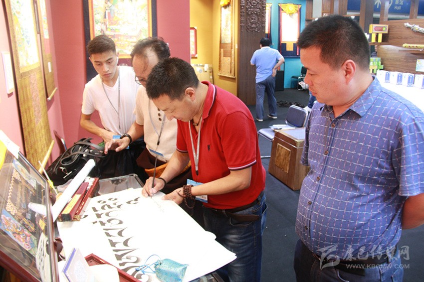 本屆文博會(huì),巴松鄧珠帶來(lái)了一件藏文書(shū)法作品《格薩爾王》,讓現(xiàn)場(chǎng)觀眾嘖嘖稱贊。孫先生說(shuō):“把書(shū)法作品用藏族唐卡藝術(shù)的裝裱方式來(lái)裝裱,真讓我開(kāi)了眼界。這件作品圖文并茂,真是太棒了,讓我覺(jué)得甘孜這個(gè)地方特別神圣,令人向往。我以后有機(jī)會(huì)不僅要好好練習(xí)藏文書(shū)法,還要去甘孜旅游。”